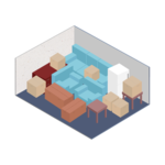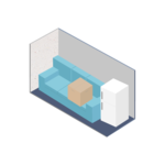 It fits furnishings of a mid-sized bedroom, including a queen-sized bed, a dresser, a TV and several small to medium-sized boxes.